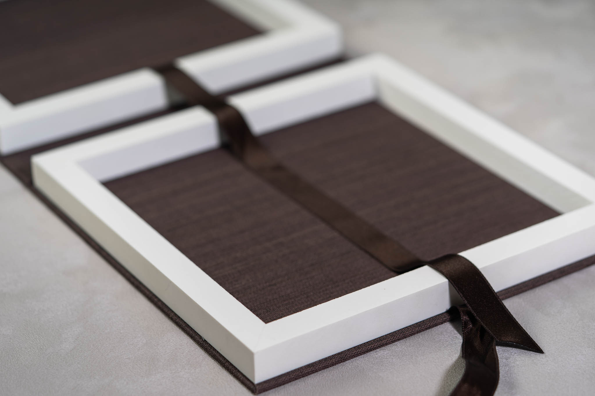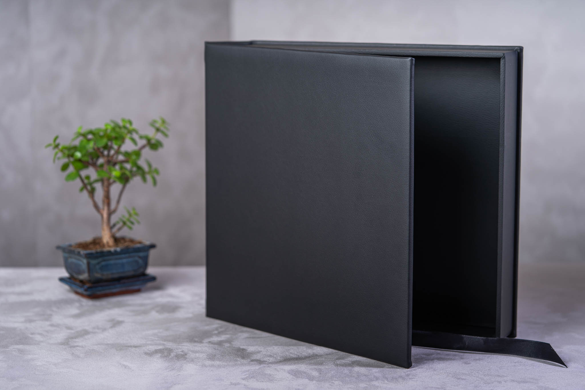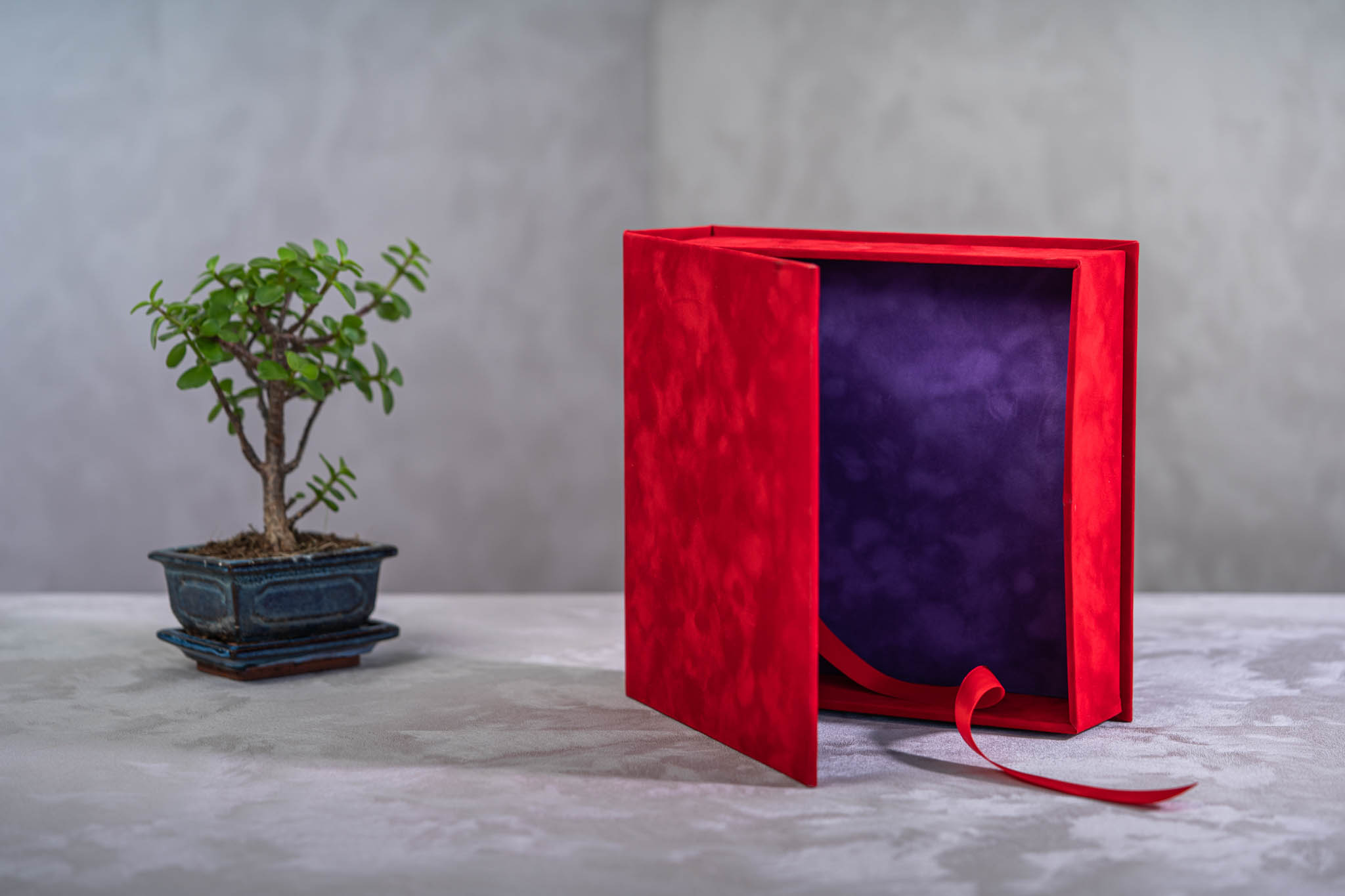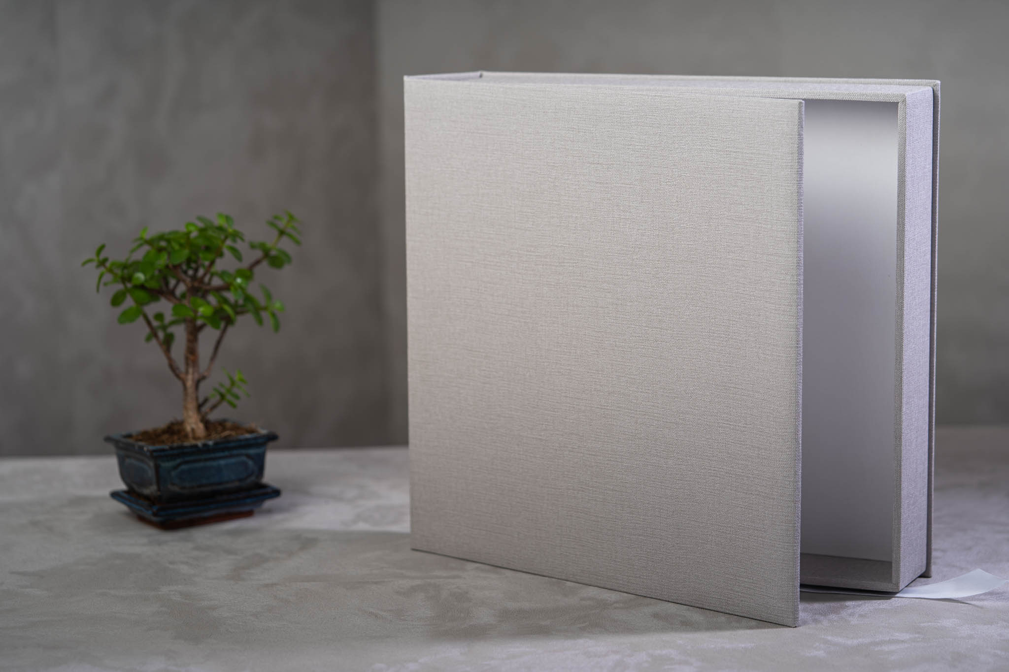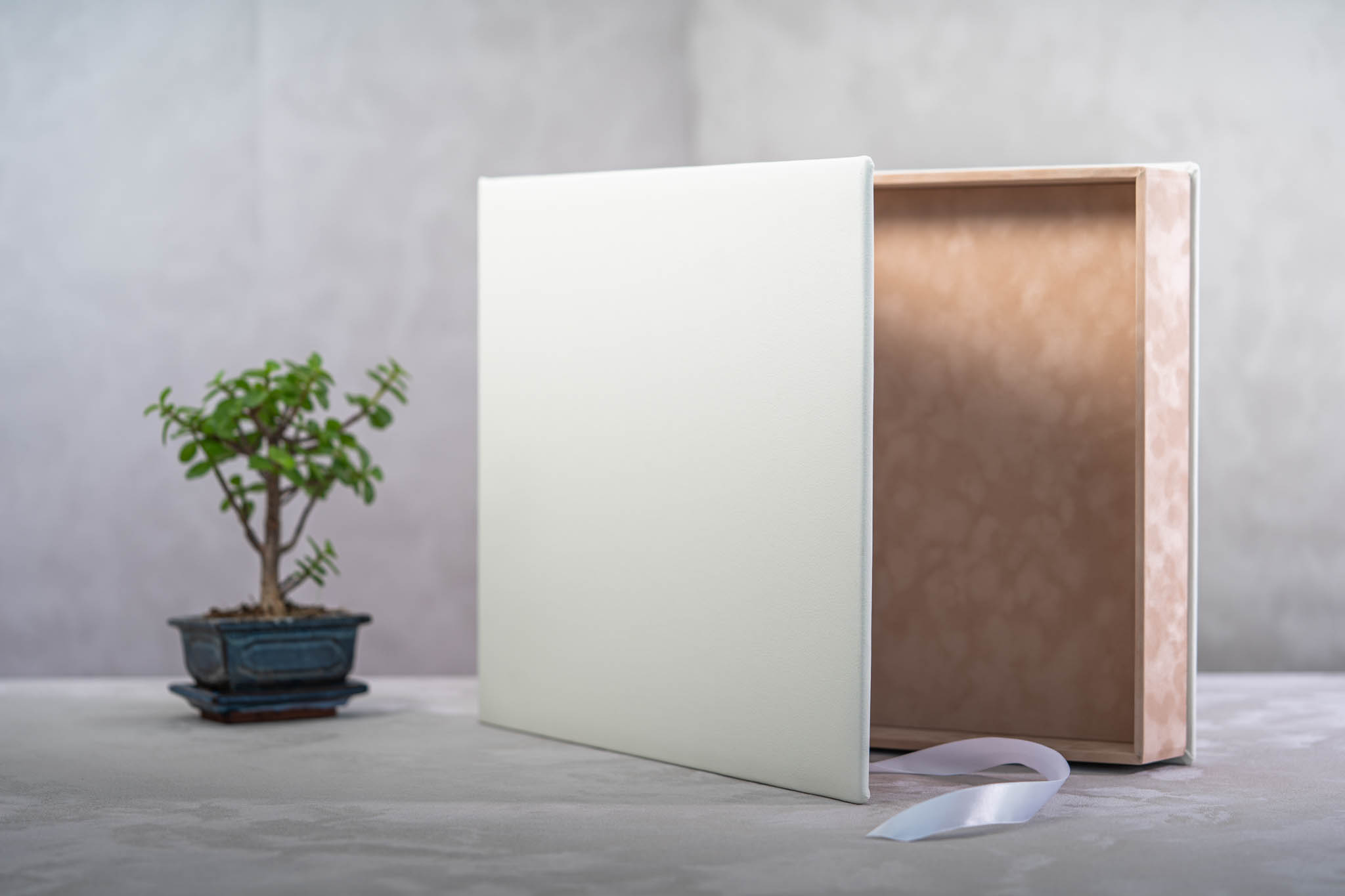 Cutia albumului are două roluri, ambele foarte importante: protecția și prezentarea. Păstrând albumul în cutie pe termen lung, acesta va fi protejat de praf, de urme de degete și alte „dezastre” ce s-ar putea întâmpla prin casă, dar și în cazul în care transporți albumul pentru a-l arăta cuiva drag. Prezentarea va fi mult îmbunătățită, privitorul fiind întâmpinat de o atingere catifelată a materialului precum și de liniile simple și elegante ale cutiei. Extragerea albumului din cutie realizează cu ajutorul unei panglici special alese pentru a complementa culorile și a complimenta experiența utilizării.